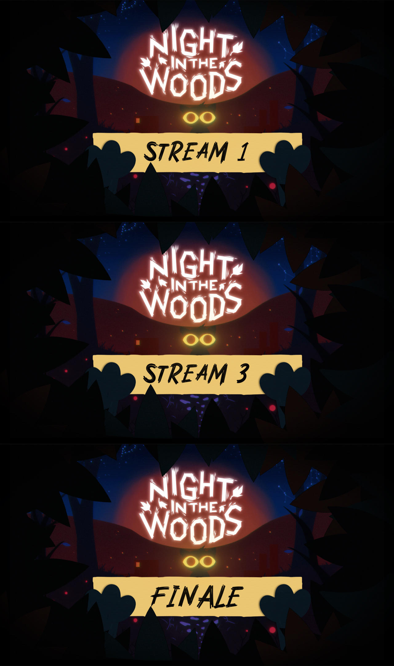 Here I imitated the game’s title screen, down to the black graphic behind the text, which the game uses for selecting options. The blurred background is relevant to each stream.